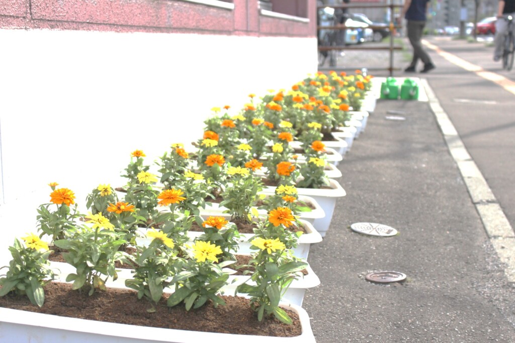 先日は、花を植えるための準備として、プランターの洗浄や、排水性や通気性をより良くするための小石を敷く作業などを行いました。
