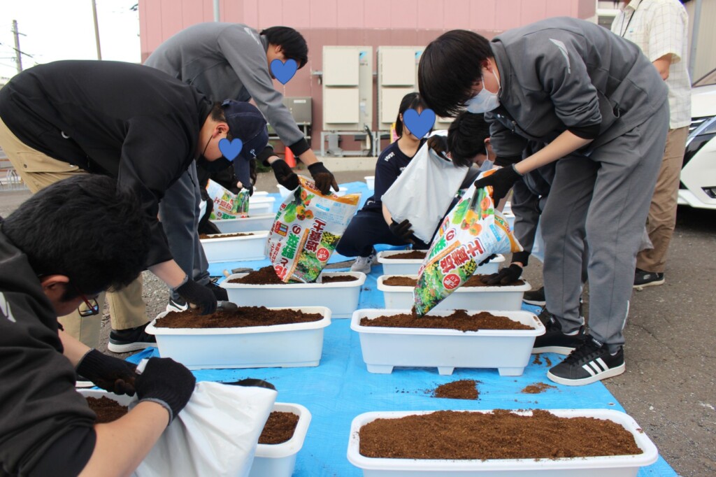 委員長・副委員長から作業の指示を行い、土をプランターに入れることから、花の植え付け、配置まで協力して全員が取り組みました。
