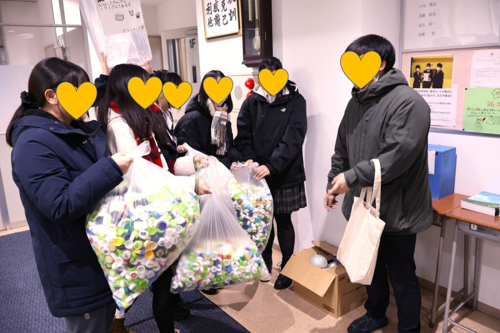学校に戻ってからは、校内で集めているペットボトルキャップを社会福祉協議会の方にお渡ししました。今回集まったキャップの量は、大きな袋2つ以上!